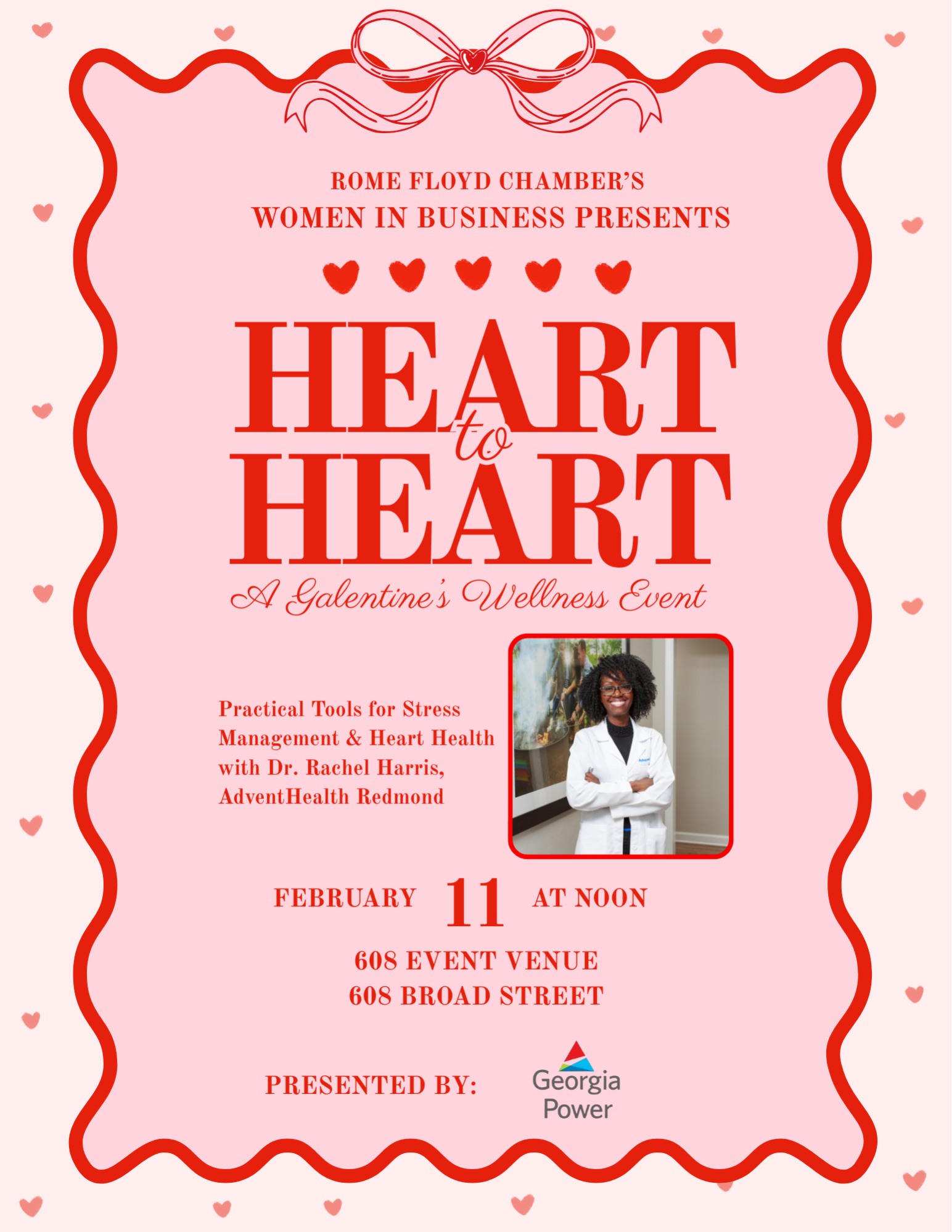 Join the Rome Floyd Chamber’s Women in Business group for a special Galentine’s Day luncheon focused on caring for your heart health. As we kick off the new year, stress can take a toll on both our well-being and our heart health. Especially for women balancing leadership, careers, and life.