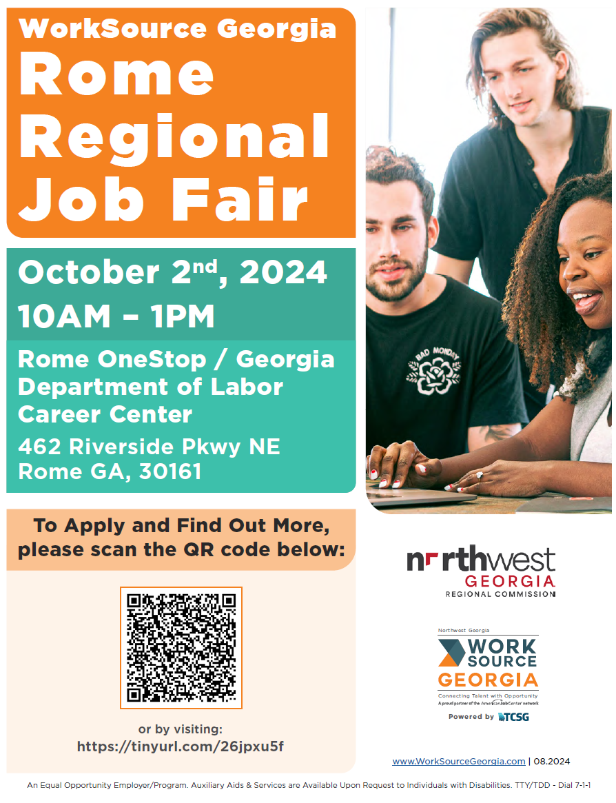 A job fair including around 10 employers in the Rome area happening at the Rome OneStop located in the Georgia Department of Labor Office.