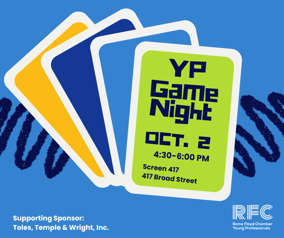It’s game on, YPs! Join us for a fun night of games, snacks, and laughs with your fellow Young Professionals. Whether you’re ultra competitive or just here for the snacks, we’d love to see you there. Thank you to our supporting sponsor: Toles, Temple & Wright, Inc. You must be a YP member to attend this event. If you are not a member, you can sign up here:https://romefloydchamberofcommercega.growthzoneapp.com/ap/Form/Fill/pB2gNsyp?cid=%20{{%20CContactId