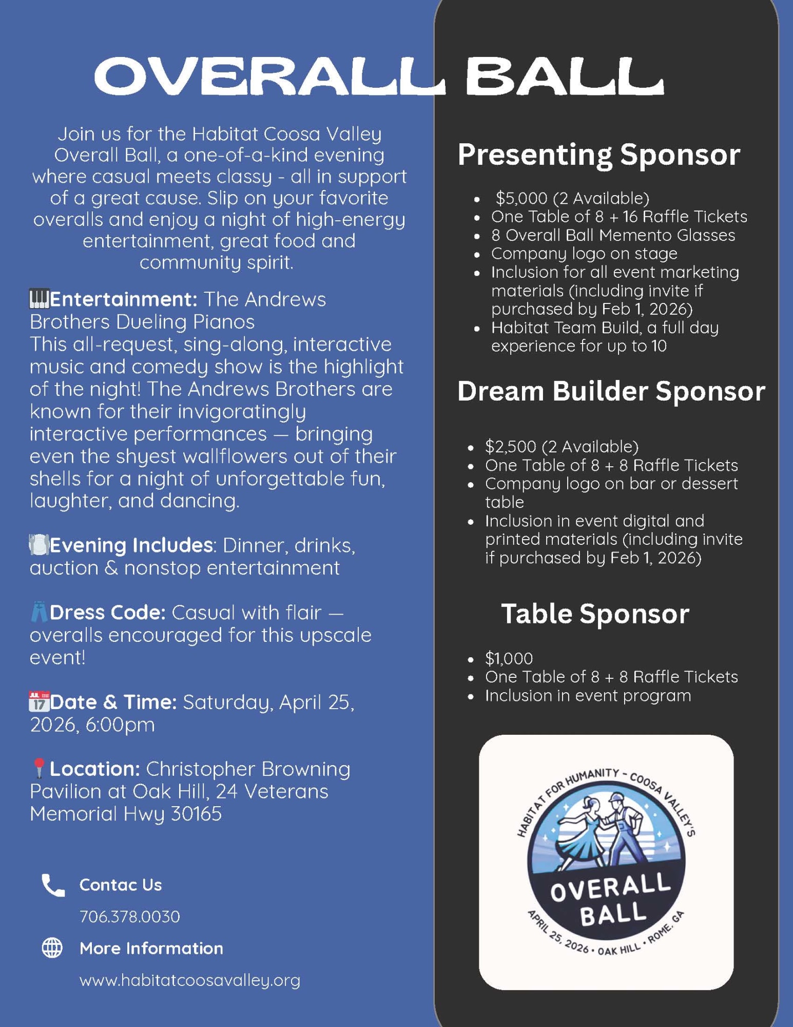 Slip on your favorite overalls and join us for a one-of-a-kind evening packed with high-energy entertainment, delicious food, and unbeatable community spirit - all in support of Habitat for Humanity Coosa Valley.
