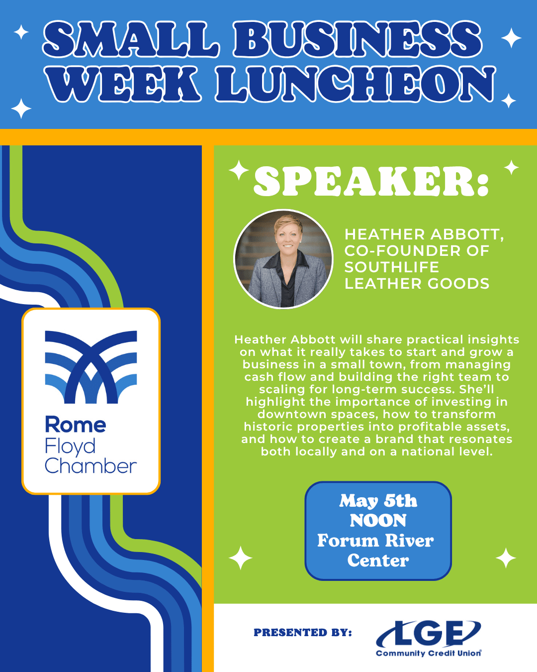 DESCRIPTION:Calling all small businesses! Join us for our Small Business Week Luncheon\, presented by LGE Community Credit Union\, as we celebrate the impact you make in our community.Enjoy a great lunch and hear from Heather Abbott\, co-founder of SouthLife Leather. For nearly a decade\, she and her husband traveled coast to coast building their business through trade shows and wholesale partnerships with brands like Bass Pro Shops\, Grand Ole Opry\, and Ryman Entertainment. Their designs have also been worn by artists like Miranda Lambert\, Blake Shelton\, and Little Big Town.